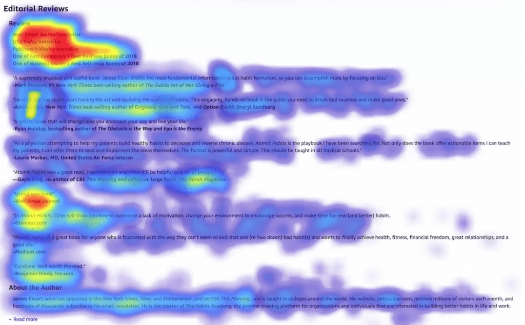The heatmap below was created by tracking the eye movements of Amazon customers. Notice how the names of publications and review outlets received the most eye traffic. That’s because customers care more about the legitimacy of a review than what it says.