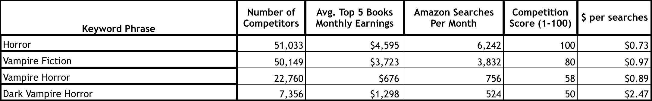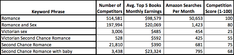 In this example, we see how adding the time period “Victorian” to the type of romance “second chance” not only reduced the competition greatly, but it actually shows authors earning more money as well. Although searches per month are lower, it's great to see that there are still a significant number of searches with much lower competition.