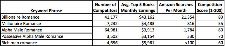 As you can see from the data above, trying to find terms representing a rich man role or a dominant role produced vastly different numbers. “Billionaire romance” seems to be the most popular, however, “millionaire romance” is still highly searched for with much less competition. The other options don't seem as promising considering their high competition or lack of searches (as you can see with “rich man romance”).