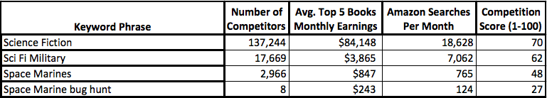 With the example above, I've shown that by niching down in the type of genre, we can identify areas that readers are searching for and have low competition for an author. “Science fiction” and “sci-fi military” are too broad and too competitive. As I narrowed further into “space marines,” I discovered that there are a significant number of readers who want a story about space marines fighting ant hive-like hordes of aliens (think Starship Troopers – or at least that’s the kind of story these sci-fi fans enjoy and are looking for).