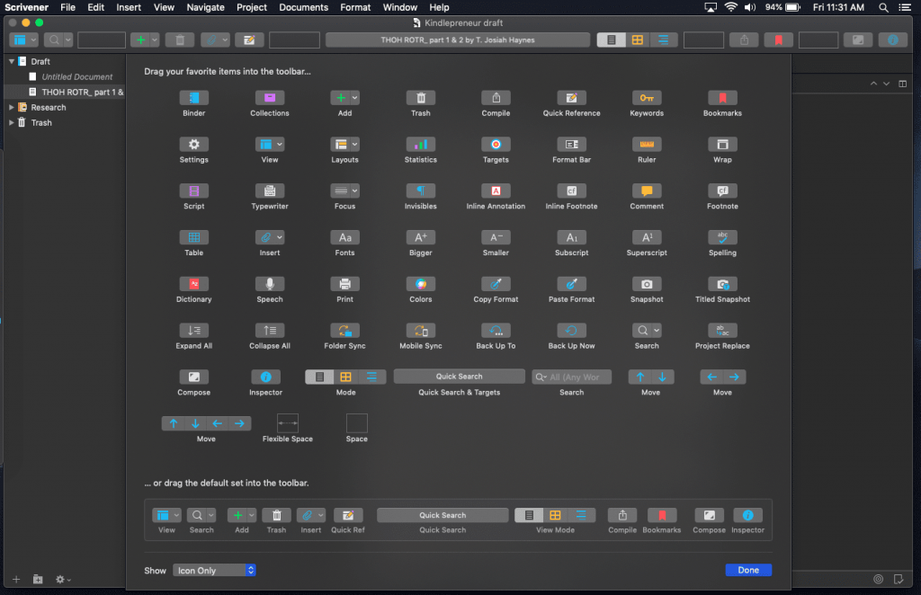 One of my favorite aspects of Scrivener is that you can customize the toolbar.