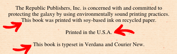 On the copyright page, you can include any details about your publishing company’s environmentally-friendly printing practices, the location of printing, fonts you used, etc.