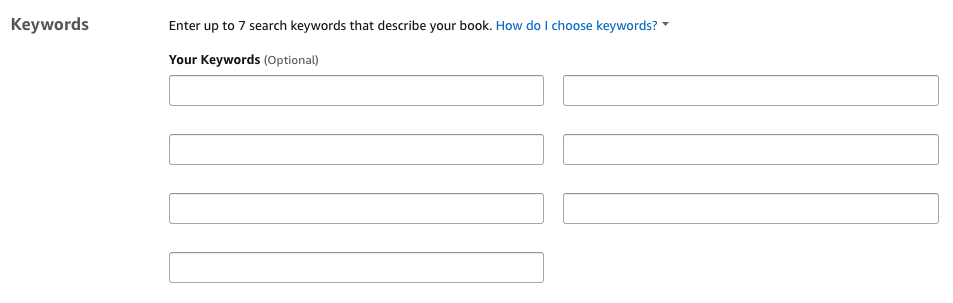Amazon presents us with seven boxes in which we can enter our desired target kindle keywords. In each box, we can use up to 50 characters, which allows us to either put in a particular target phrase we want to rank for, or fill up the box to include as many phrases as possible.