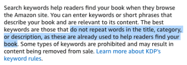 You may have already selected your categories already, but since Amazon now only lets you select three categories, it's important to use Keywords as a way to fortify those category selections, and possibly even get Amazon to place you in more categories.