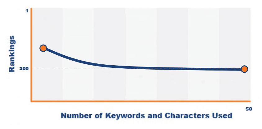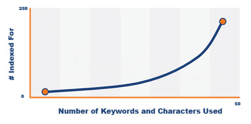 It turns out that Amazon does use all variations of the words you enter as you can see from the diagram above. Therefore, if you typed in “Dragon War Mage” into one of the 7 keyword boxes, you would also be indexed for War Dragon Mage, Mage Dragon, War Mage, Mage, and all other versions of the phrase. This is a major reason why our graph above shows an almost exponential increase in words indexed as you move to the right.